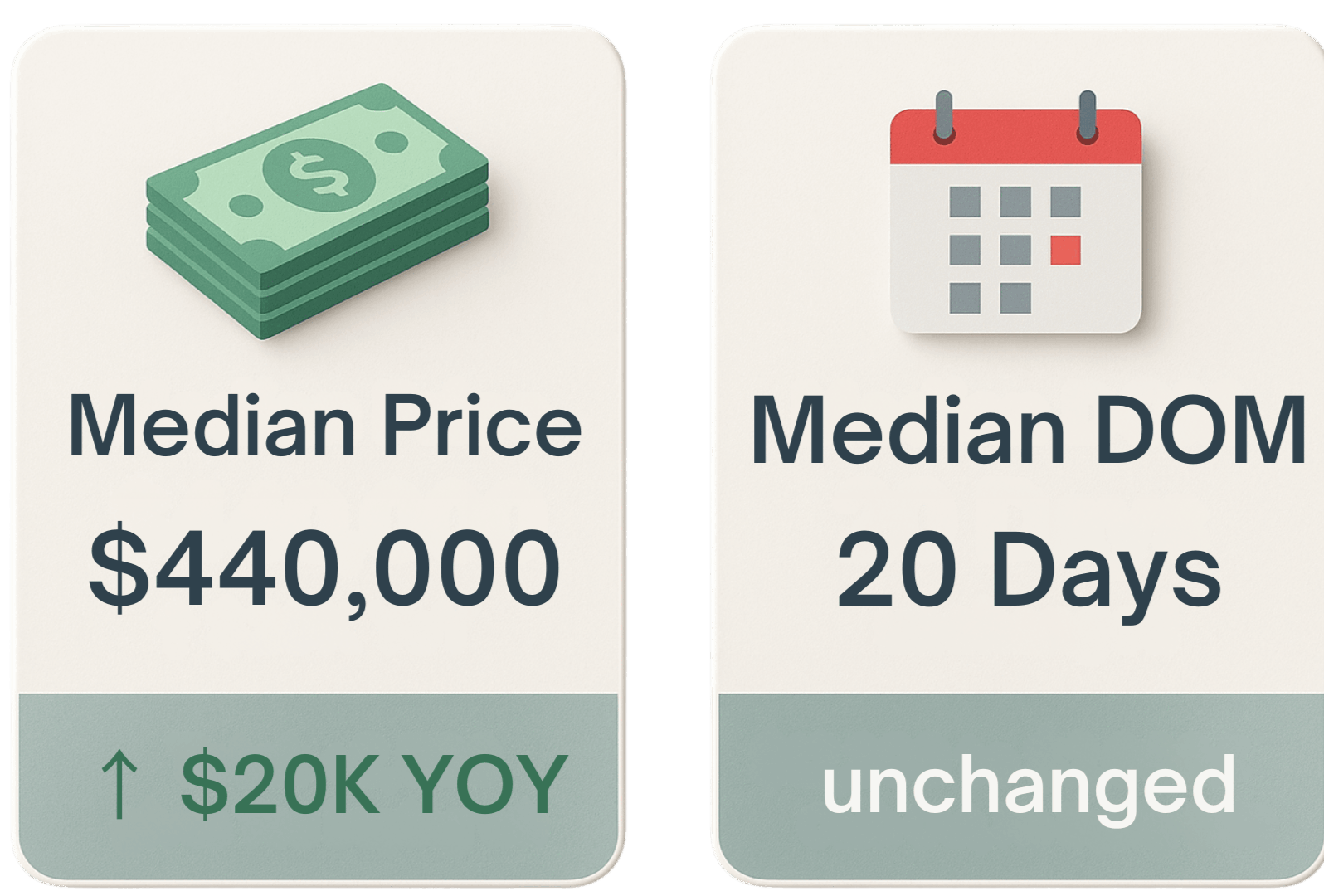 Prices remain resilient. The median residential sale price is $440,000, flat month-over-month but up $20,000 from June 2024. Median days on market? Still 20 days.